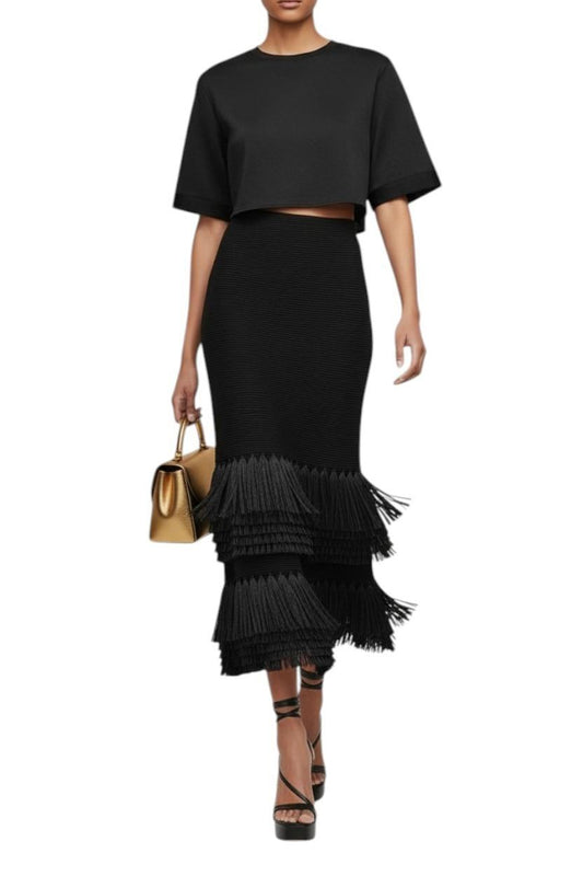 Aje Agave Knit Raffia Midi Skirt | Stretch, Black, Knit, Ribbed, High Waist
