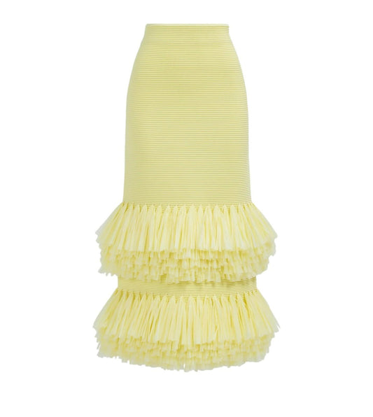 Aje Agave Knit Raffia Midi Skirt | Stretch, Yellow, Knit, Ribbed, High Waist