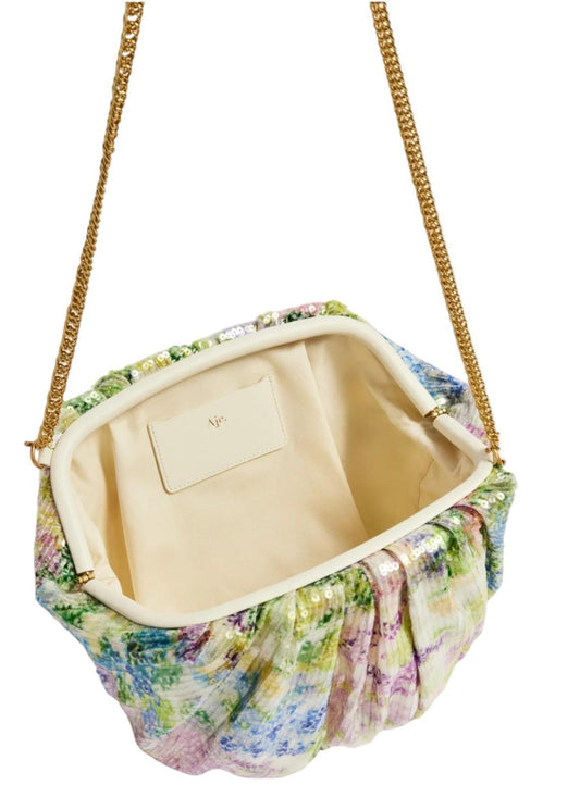 Aje Large Clutch / Cross Body Bag | Floral Sequin, Gold, Magnetic Close, Strap