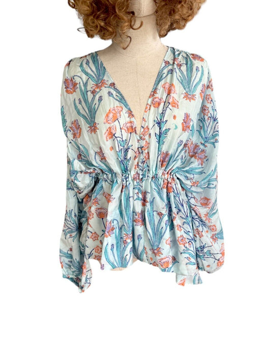 HANNAH ARTWEAR Blue Florence Silk Blouse | Tie Waist, Puff Sleeves, Silk, Floral