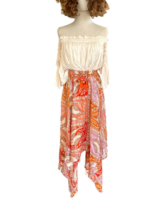 HANNAH ARTWEAR Delila Midi Skirt |100% Silk, Orange/Red Floral Print, Drawstring