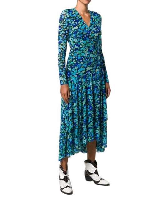 Ganni Wrap Midi Dress | Mesh Material, Lined, Stretch, Blue Floral, Size 36