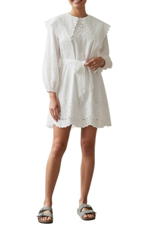 Junie Embroidered Mini Dress | White,, Linen, Belted, Collar, Embroidery, Dolman