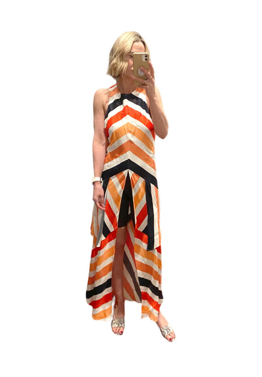 Sass & Bide Long Live Dress | Orange/White/Black, Viscose, Striped, Tiered,Sz 14