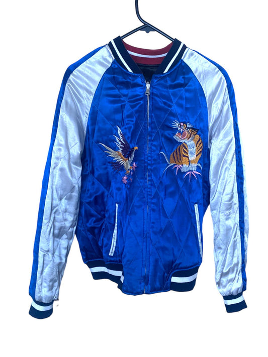TOPSHOP Bomber Jacket | Sz 12, Reversible, Black/Blue, Embroidered, Quilted