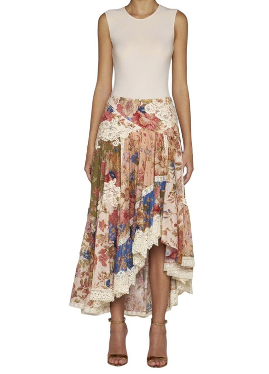 Zimmermann August Asymmetric Skirt | Floral, Lace, Cotton, Spliced, High Waist