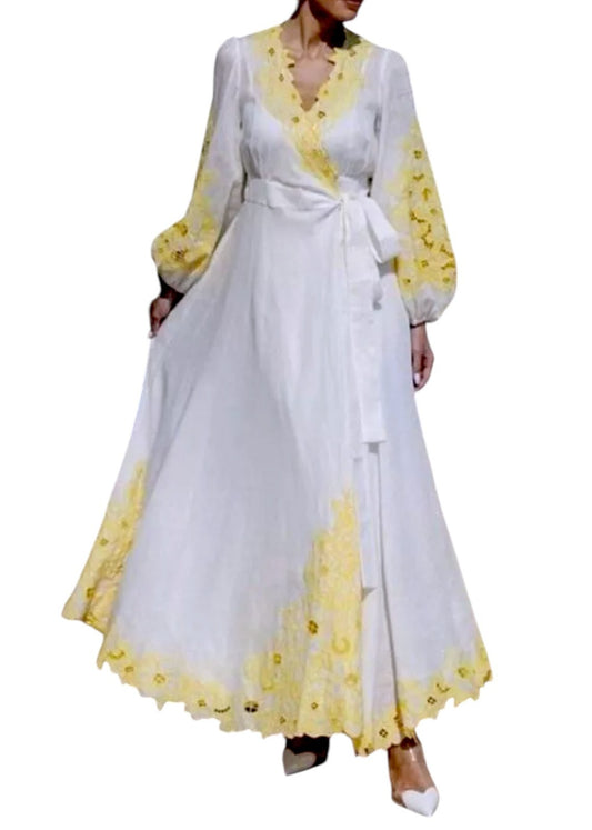 Zimmermann Golden Embroidered Midi Dress | White/Yellow, Wrap, Anglaise, Dolman