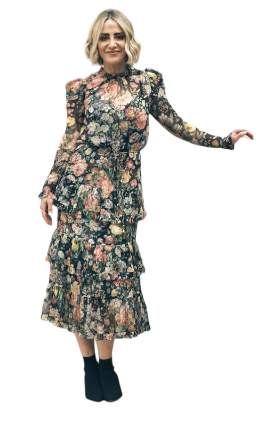 Zimmermann Floral Silk Midi Dress | Matching Slip, Sz 1, Tiered, Draped, Belted