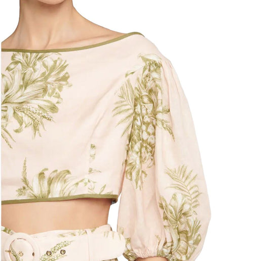 Zimmermann Empire Bodice | Cropped Top, Puff Sleeves, Linen, Pink/Khaki Floral