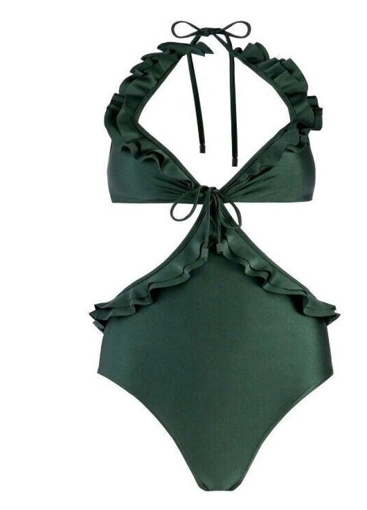 Zimmermann Estelle Ruffle Halter One Piece | Cutout, Green Liquorice, Ruffles