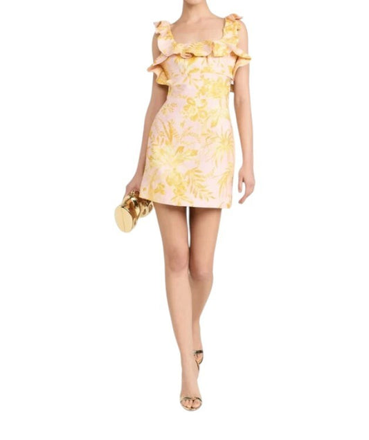 Zimmermann Golden Ruffle Mini Dress |Pink/Gold Floral, Cut Outs, Linen, Backless