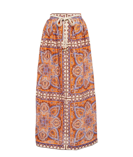 Zimmermann Halycon Maxi Skirt | Boho, Orange/Blue Paisley, Woven Belt, Embellish