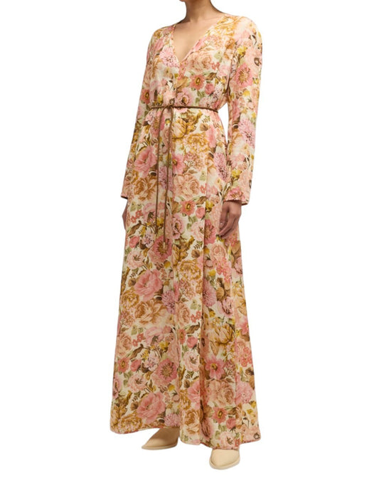 Zimmermann Golden Plunge Maxi Dress | Pink Rose Floral, Belt, Linen, Long Sleeve