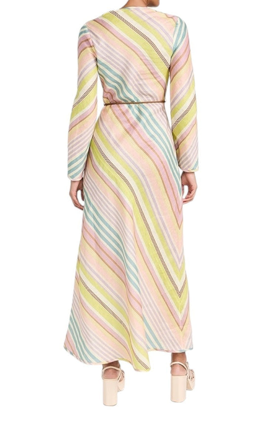 Zimmermann Halliday Bias Long Dress | Multi Stripe, Linen, Belt, Long Sleeve