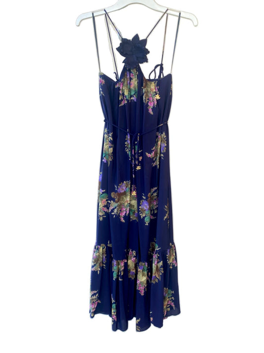 Zimmermann Halter Neck Midi Dress |Navy Floral, Silk, Removable Brooch, Tie Belt