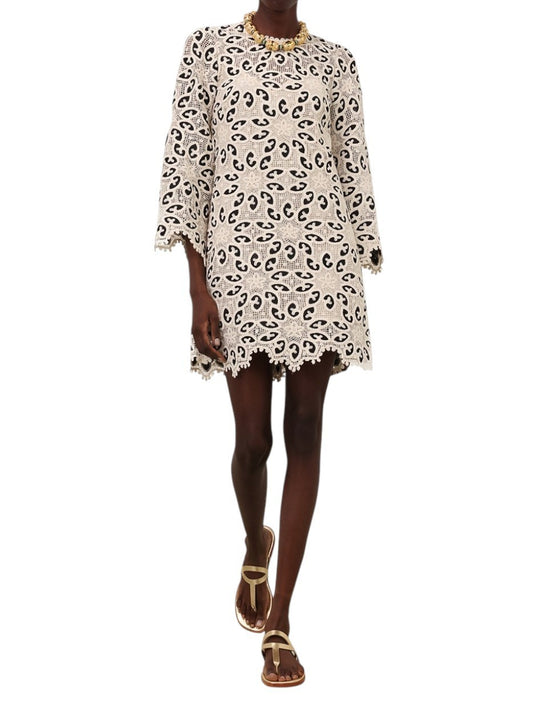 Zimmermann Ottie Lace Mini Dress |Black/White/Cream, Overlay, Long Flare Sleeve