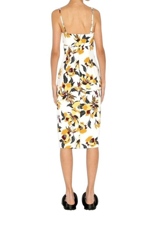 CUE Floral Midi Dress | Pencil, Yellow/black/White/Gold Floral, Side Cutouts