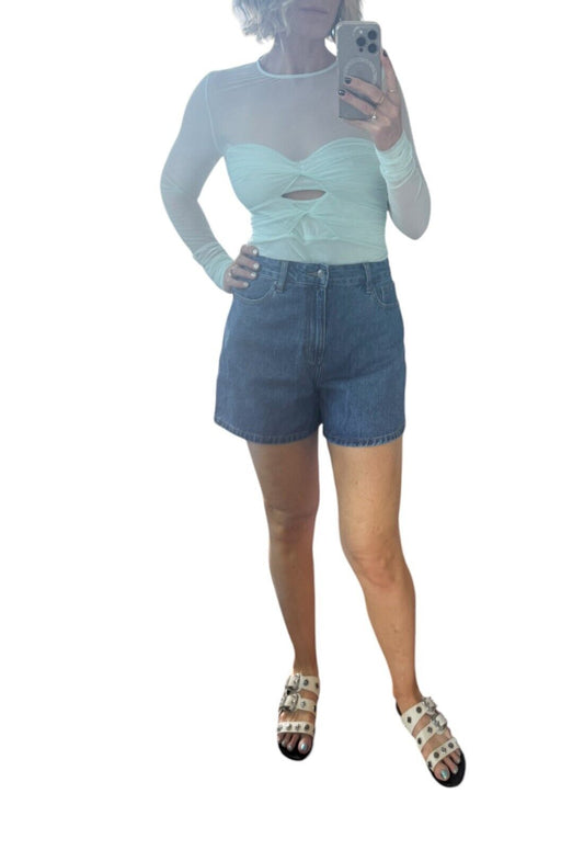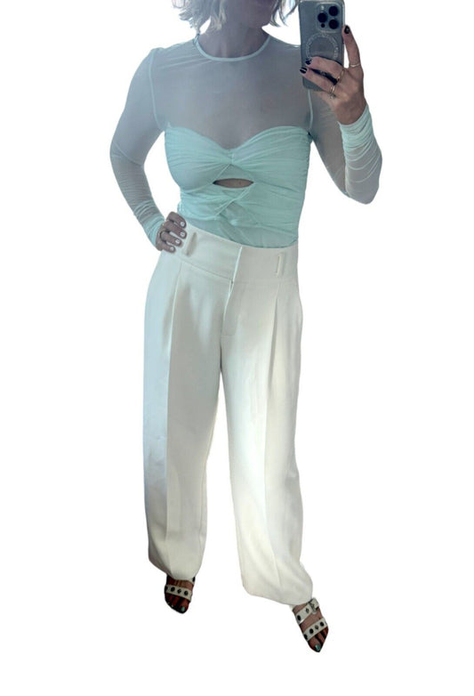 CUE Mesh Long Sleeve Gathered Top |Sz 10,Mint Green, Ruched, Sheer, Cut Out