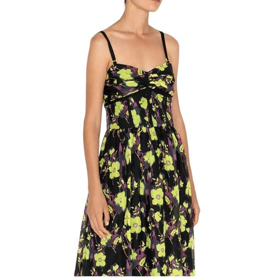 CUE Floral Midi Dress | Shoestring Straps, Black/Yellow, Size 12, Cotton/Silk