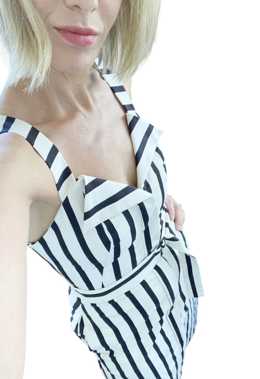 CUE Black and White Striped Cotton Midi Dress | Stretch, Belted, Collar, Zipper