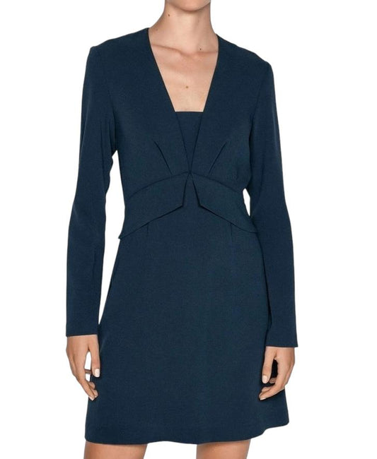 CUE Long Sleeve Mini Dress | Peplum Waist, Stretch, V Neck, Zipper, Career/Work