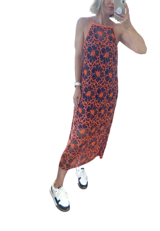 CUE Cue Contrast Floral Midi Dress | Lace Overlay, Navy & Orange, Partial Lining