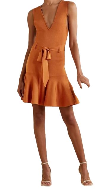 Zimmermann Knit Mini Dress | V Neck / Back, Waist Tie, Copper, Flounce Frill Hem