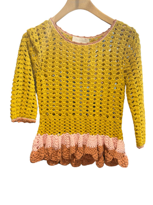 Zimmermann Laurel Crochet Frill Top | Mustard Yellow/Pink, Three Quarters Sleeve