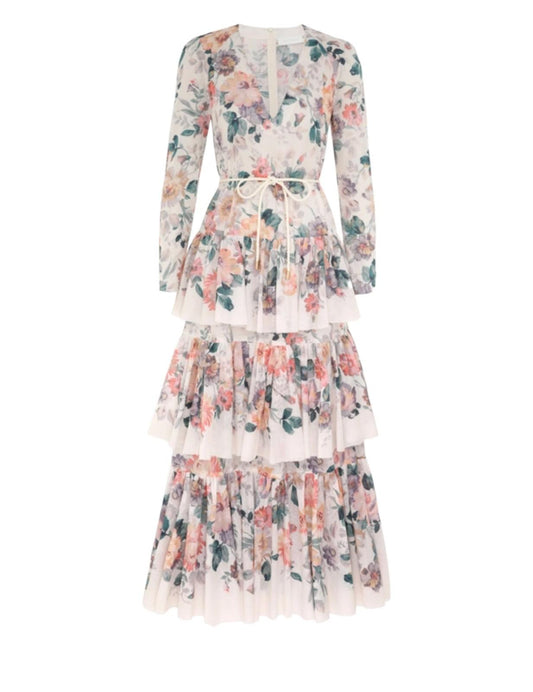 Zimmermann Acacia Tiered Maxi Dress | White Floral, V Neck, Belt, Cotton