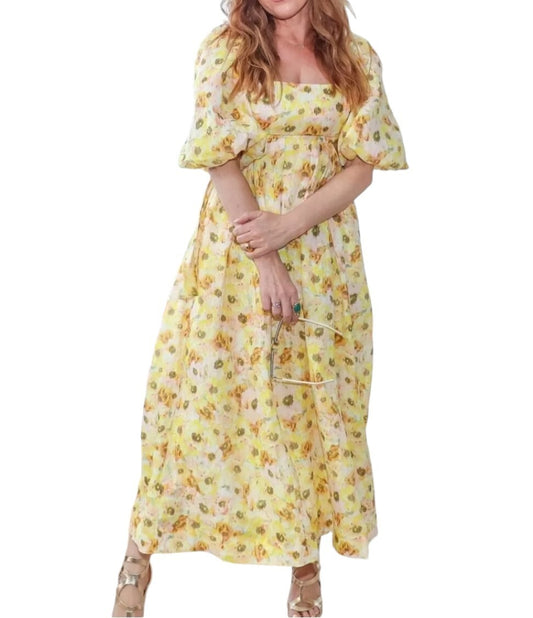 Zimmermann Lightburst Cutout Midi Dress | Yellow Foral, Puff Sleeves, Linen