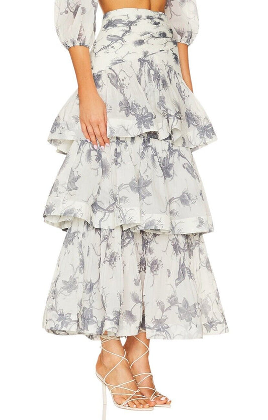 Zimmermann Pleated Tiered Skirt | Keira Navy White/Blue Print, Midi, High Waist