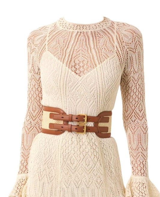 Zimmermann Raffia Belt 90 | Double Buckle, Tan/Beige, Wide, Waist, Leather, Gold