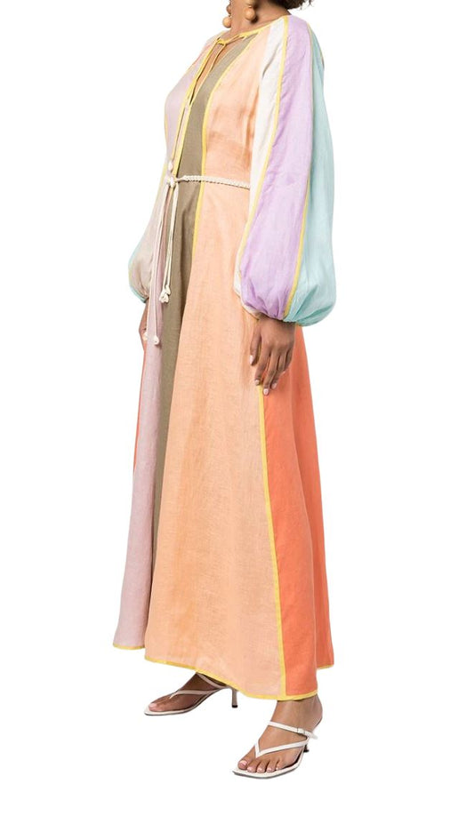 Zimmermann Lola Panelled Midi Dress| Panelled, Puff Sleeves, Belt, Rainbow Linen