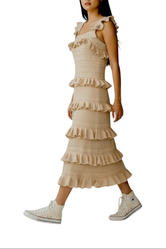 Zimmermann Illuminate Lace Frill Midi Dress | Metallic Gold/Beige, Knit, Tiered