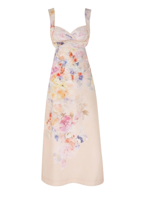 Zimmermann Illuminate Midi Dress |Cream Floral, Linen, Open Back Tie, Sweetheart