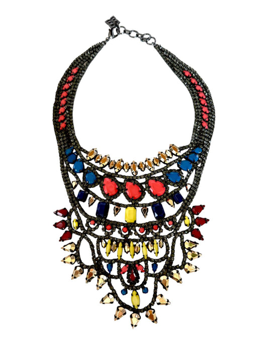 Vibrant Statement Bib Necklace | Pink/Yelow/Gold/Dark Silver Stones, Gr8 Quality