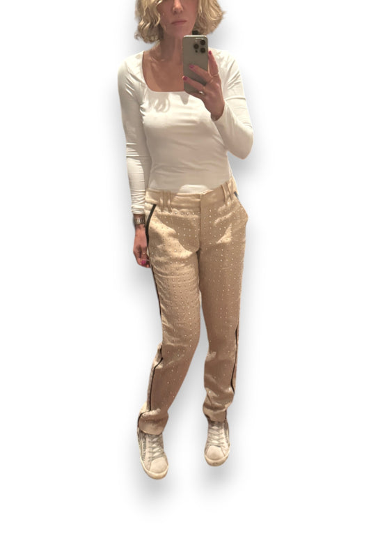 Sass & Bide Frame Mind Pants | Beige Linen, Allover Silver Studs, Sz 40; AU 10