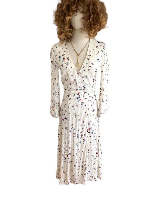 GANNI Wrap Midi Dress | White Floral, Sz 34/XS, Viscose, Bell Sleeves, V Neck