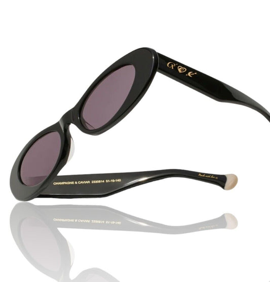 Camilla Champagne & Caviar Sunglasses | Solid Black, Cats Eye, Hand-Made, Slim
