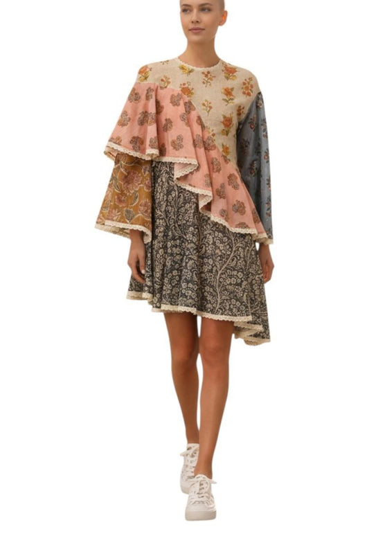Zimmermann Tallow Asymmetric Mini Dress | Spliced, Floral, Cotton, Belt, Boho