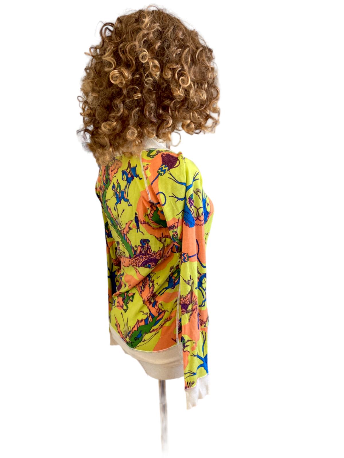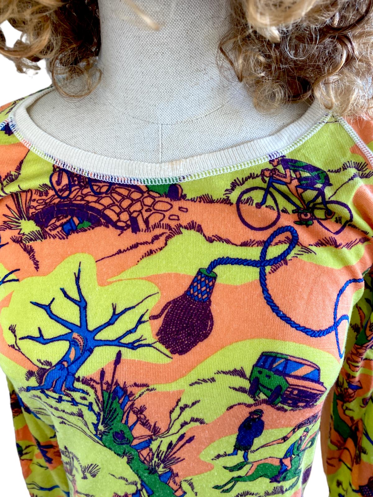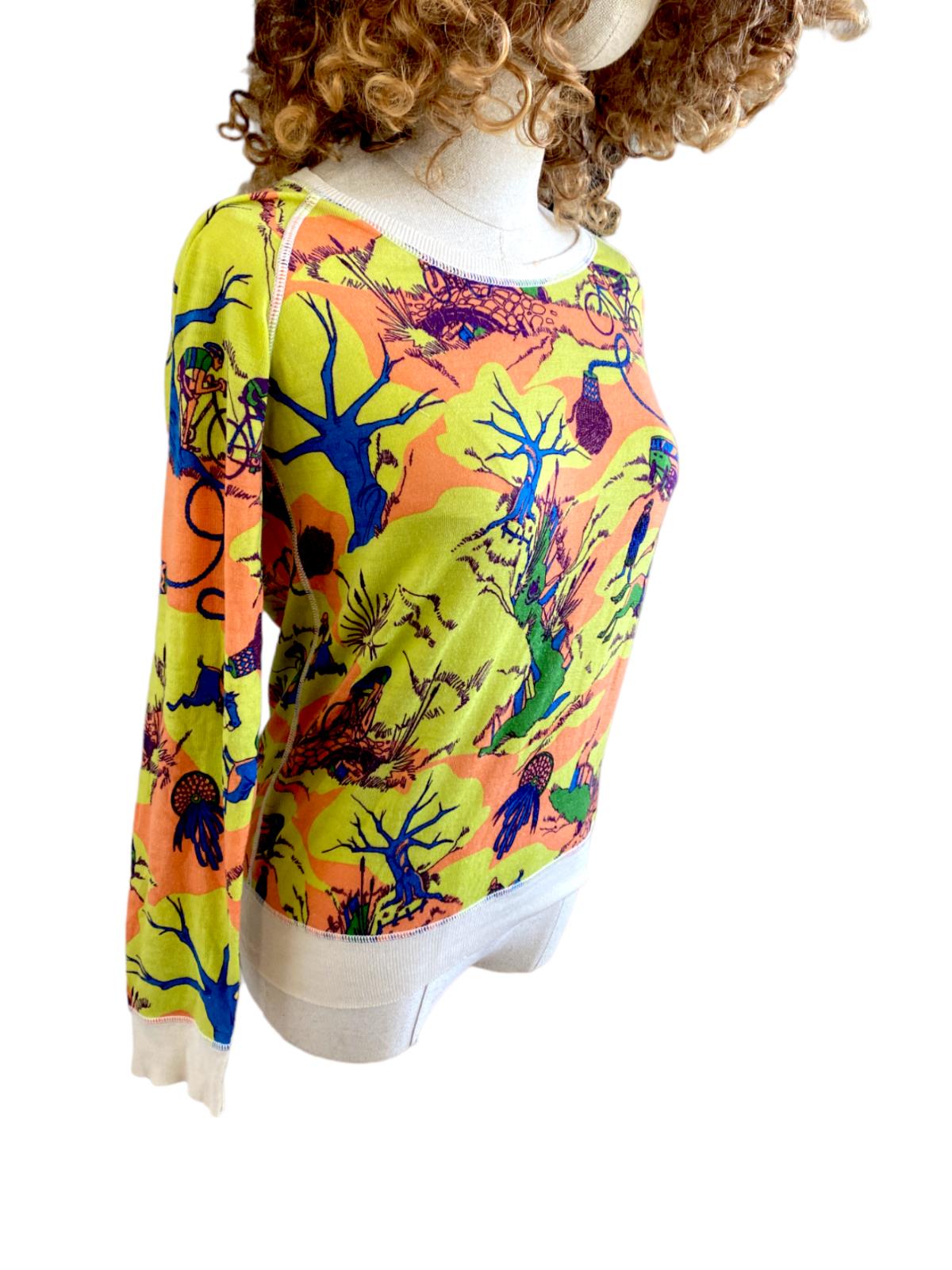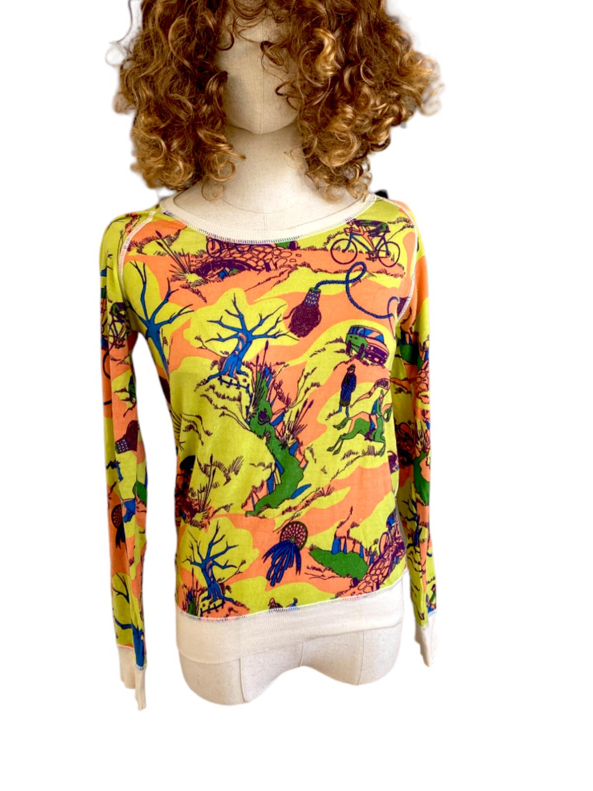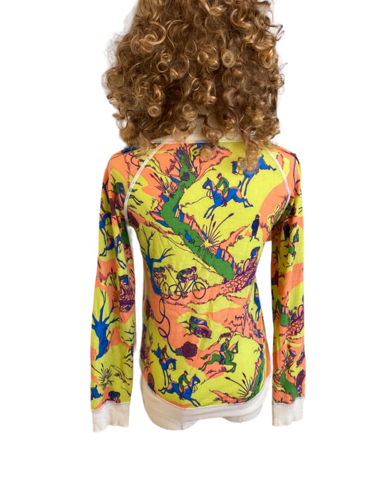 The jumper features a unique print in green, orange, blue and burgundy colours. The sprint on the jumper is of trees, cyclists, ducks, roads, horses and jockeys!