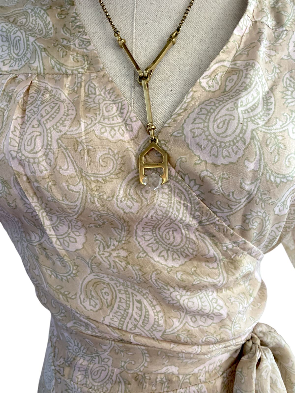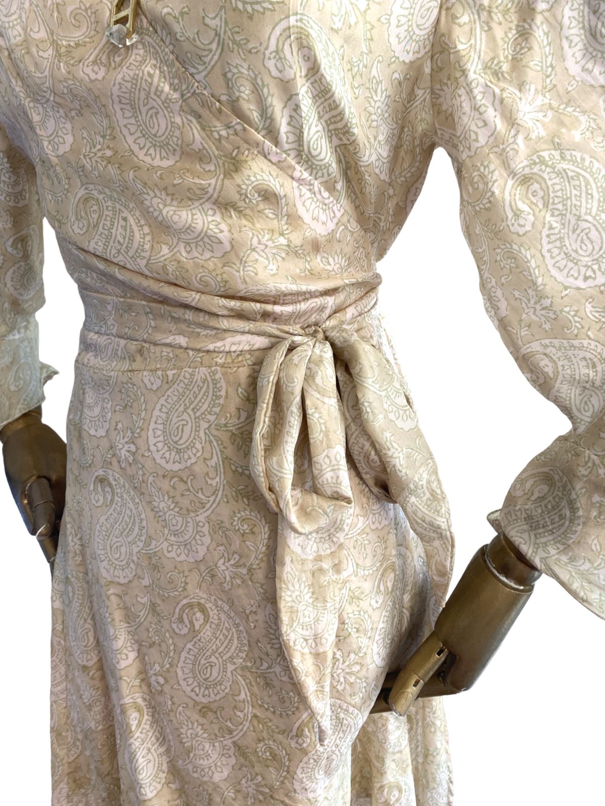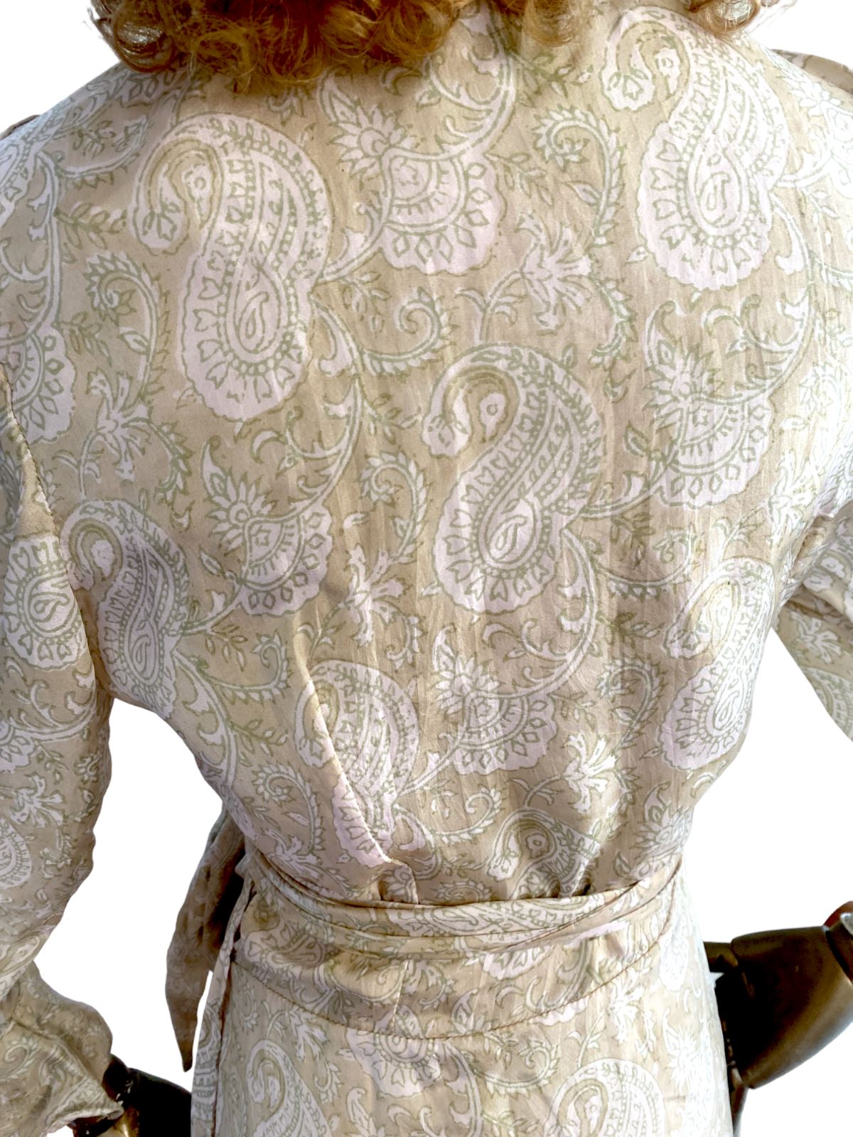 Hannah Artwear's muted beige, green and white wrap mini dress is defined by a swirling paisley printed pattern hand-applied onto the fabric using traditional woodblock printing techniques.