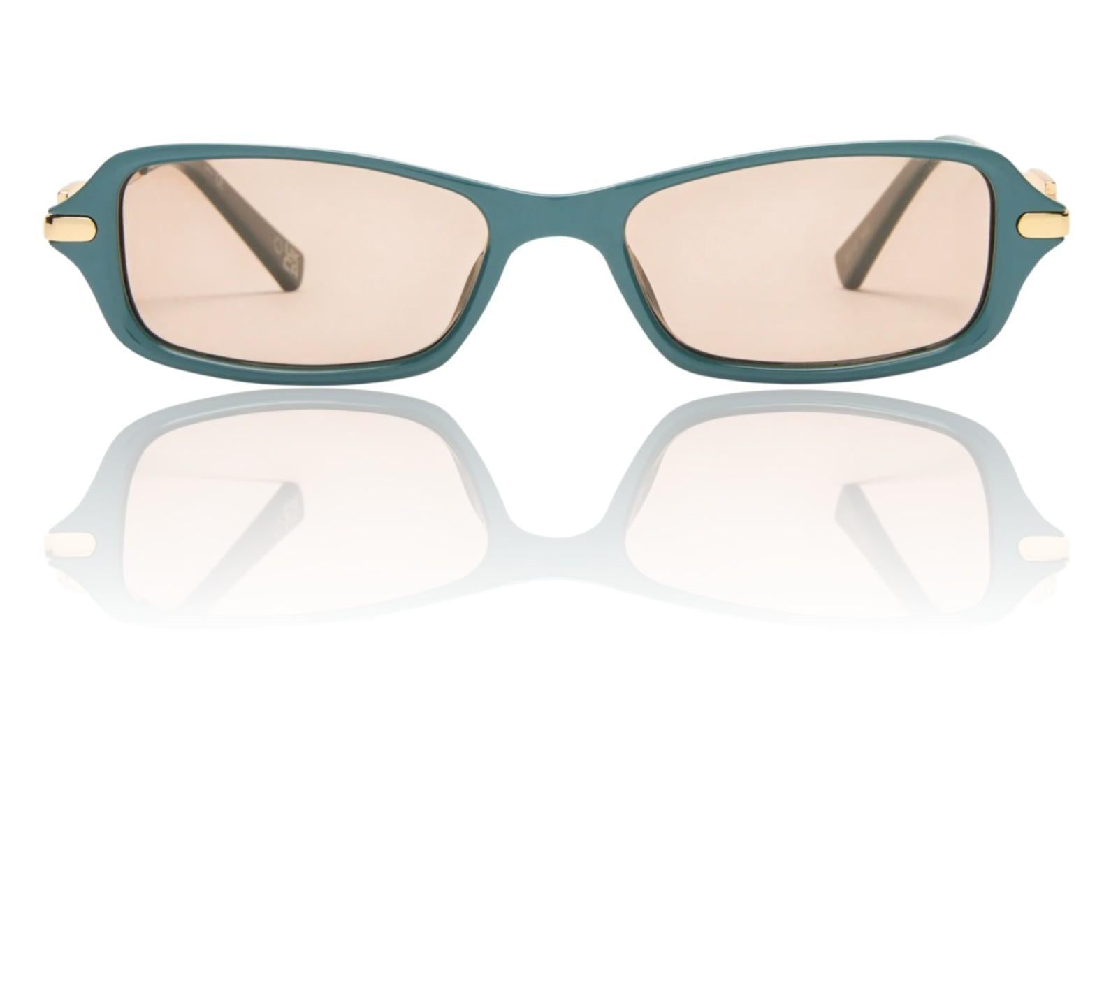 The BAMBOOZLER sunglasses by Le Specs offer a simplified Y2K aesthetic with narrow proportions. Designed with a fine profile, this rectangular silhouette features their three-dimensionally crafted cut-out Le Specs geometric flag stripe buckle temple.