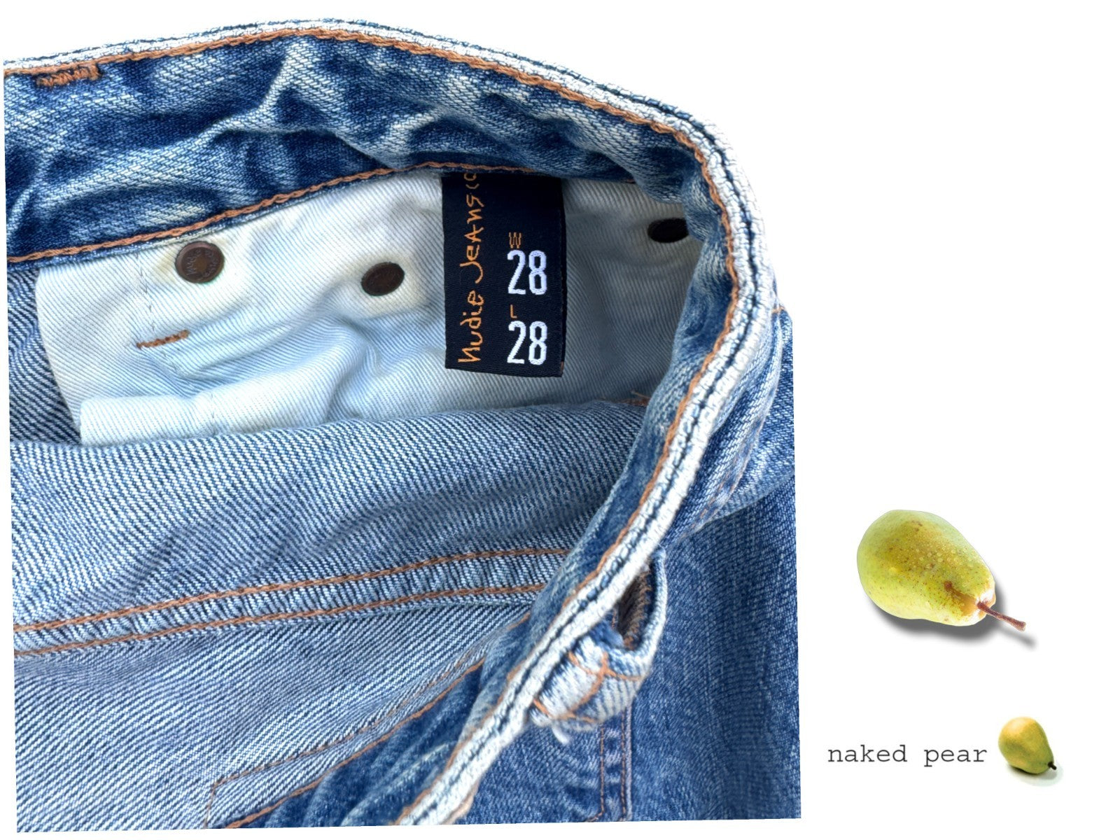 A pair of Nudie Jeans organic denim jeans for sale that have been very lightly worn and still in excellent condition. A great pair of high waisted, wide leg jeans with tobacco coloured threads at seams.