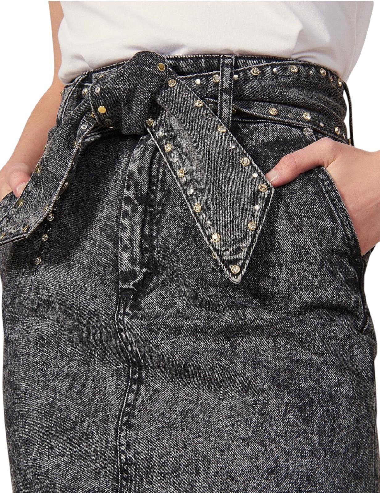 From the French brand Sandro comes this gorgeous grey denim skirt with a matching crystal-embellished tie belt. The skirt sits high in the waist and has a straight silhouette.