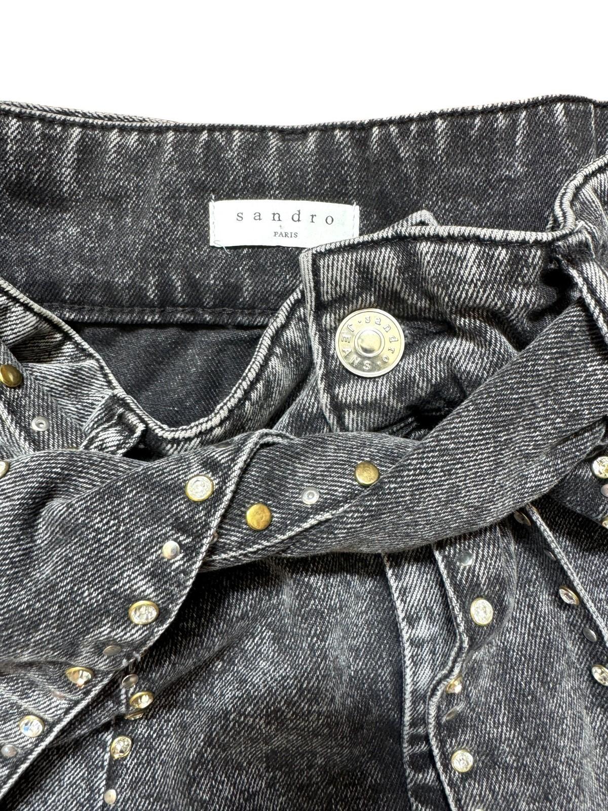 SANDRO Fredie Denim Skirt |Crystal Embellished, Sz 3, Grey, Tie Belt, High Waist