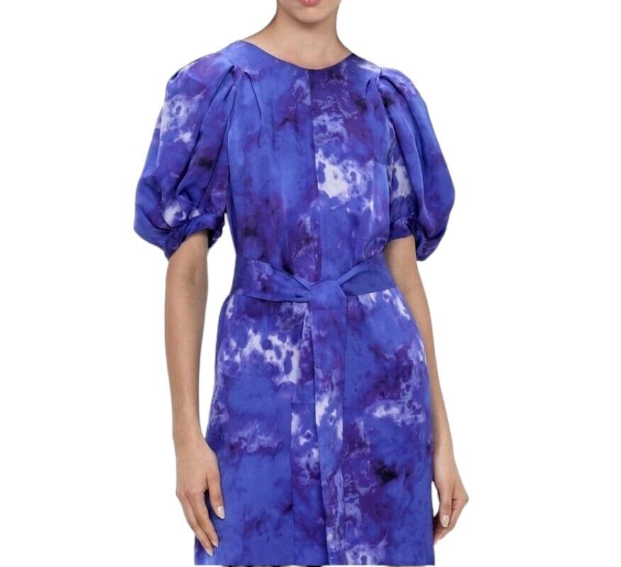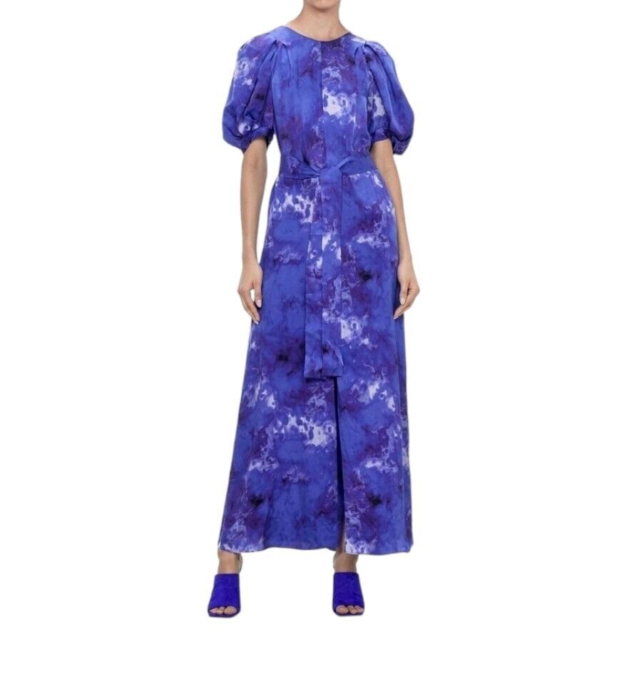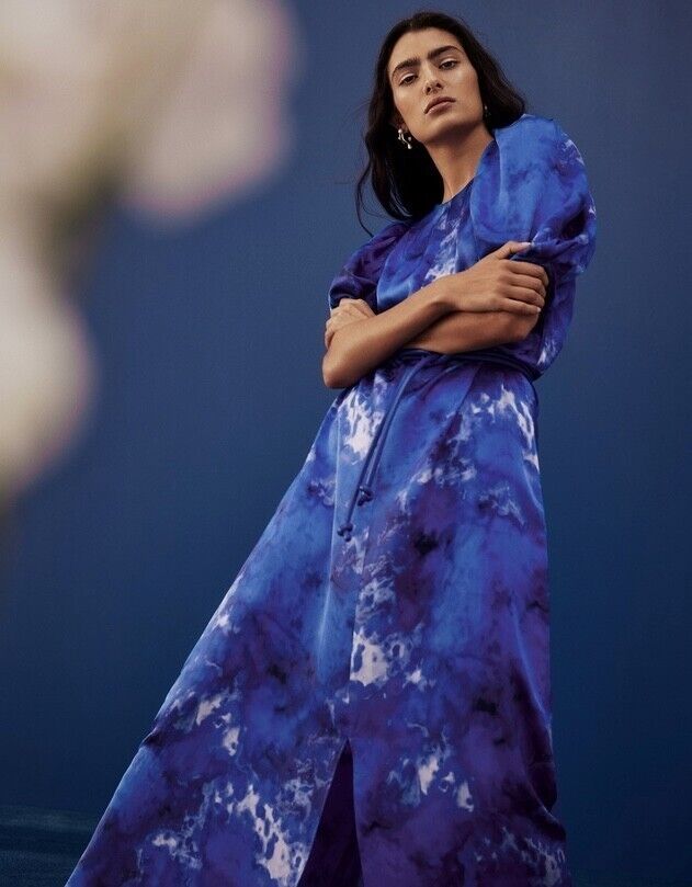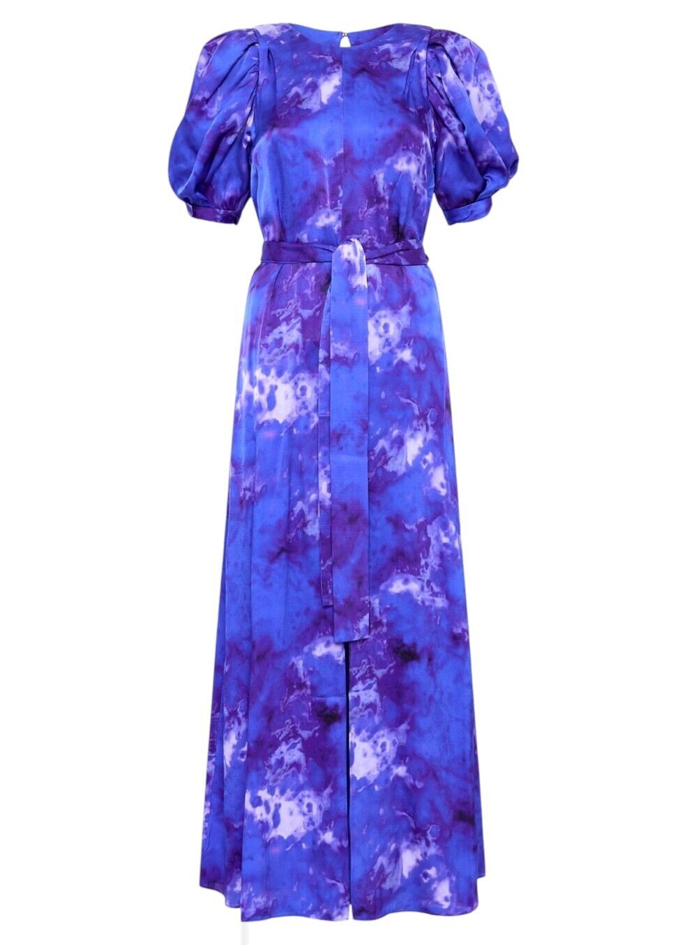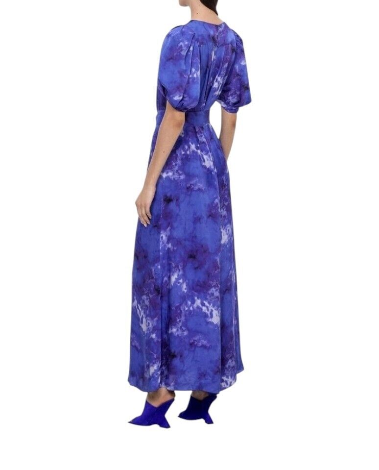 This is yet another gorgeous blue dress by Veronika Maine. This style is featured in the Summer 2023 collection. Made from a European satin viscose, this dress features Veronika Maine's signature blue Clouded print. This theme is reflected in their 2023 Fashion Week collection. The tucks at the sleeves complement the voluminous silhouette gently fitted at the waist and have a floaty, midi-length skirt. The dress is completed with a soft tie belt using the same material.