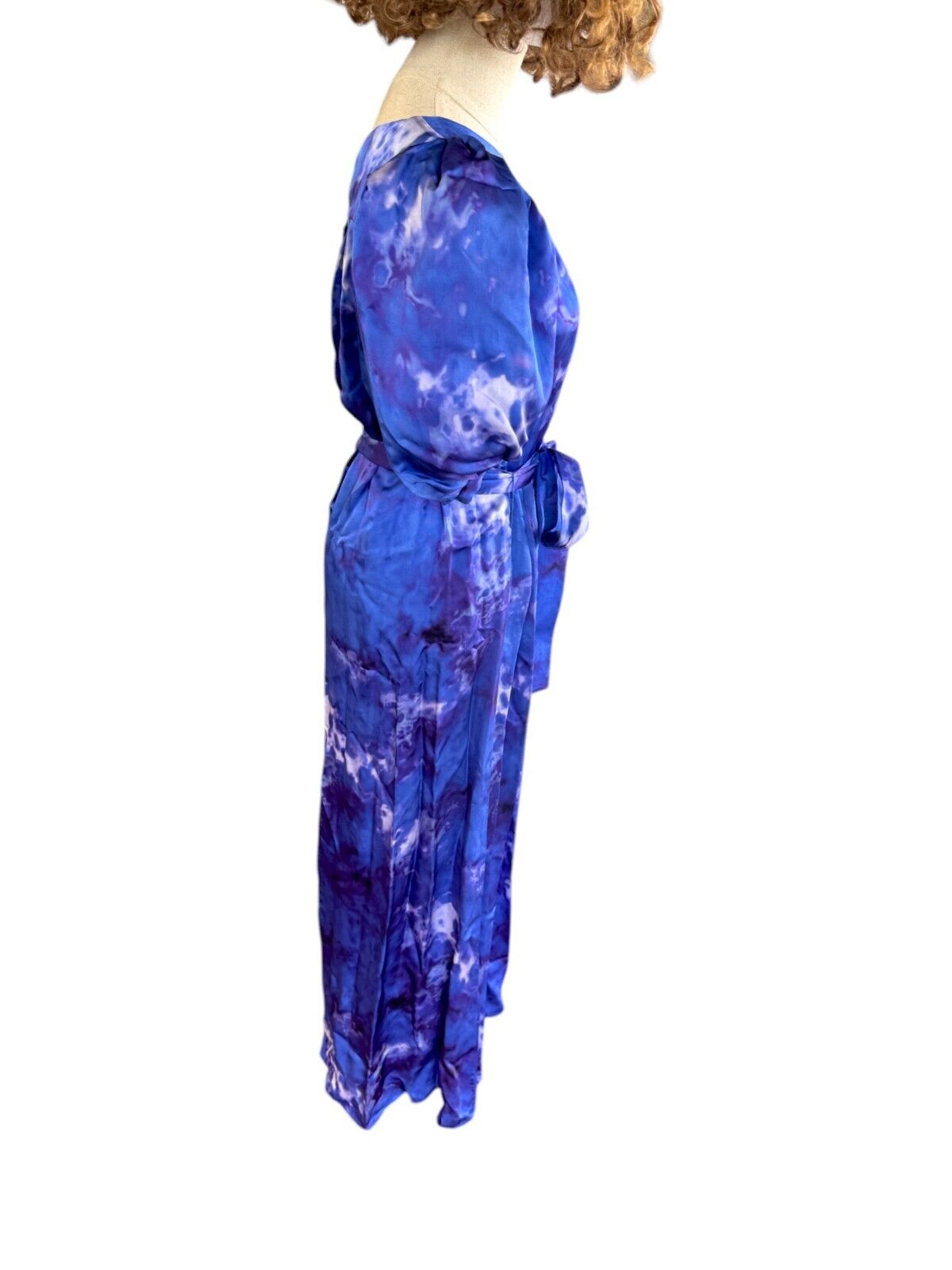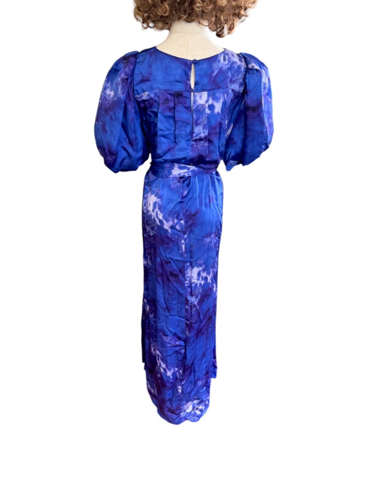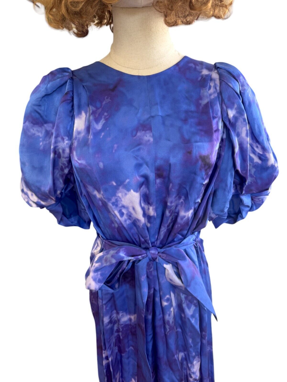 Veronika Maine Clouded Satin Midi Dress | Sz 10, Blue, Puff Sleeves, Match Belt