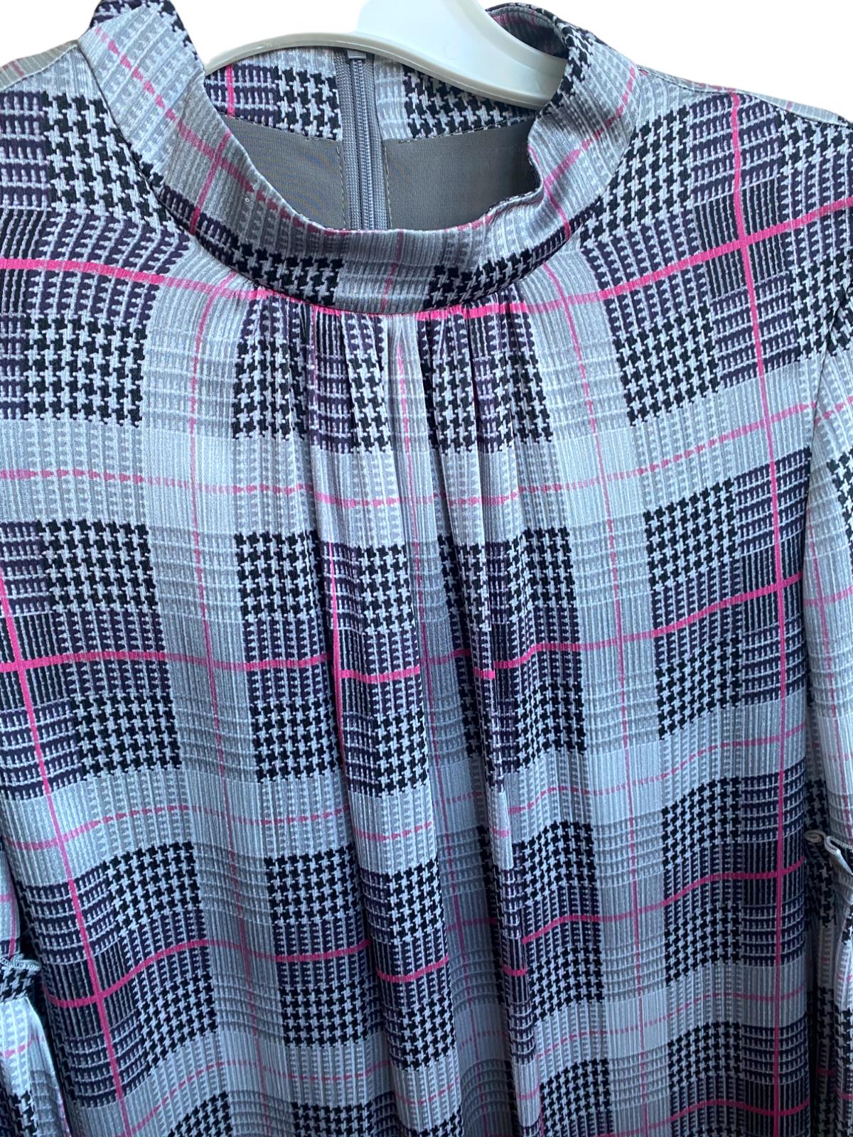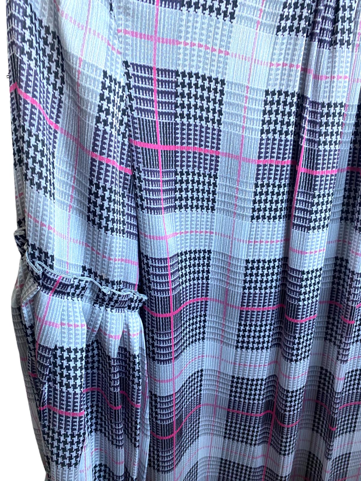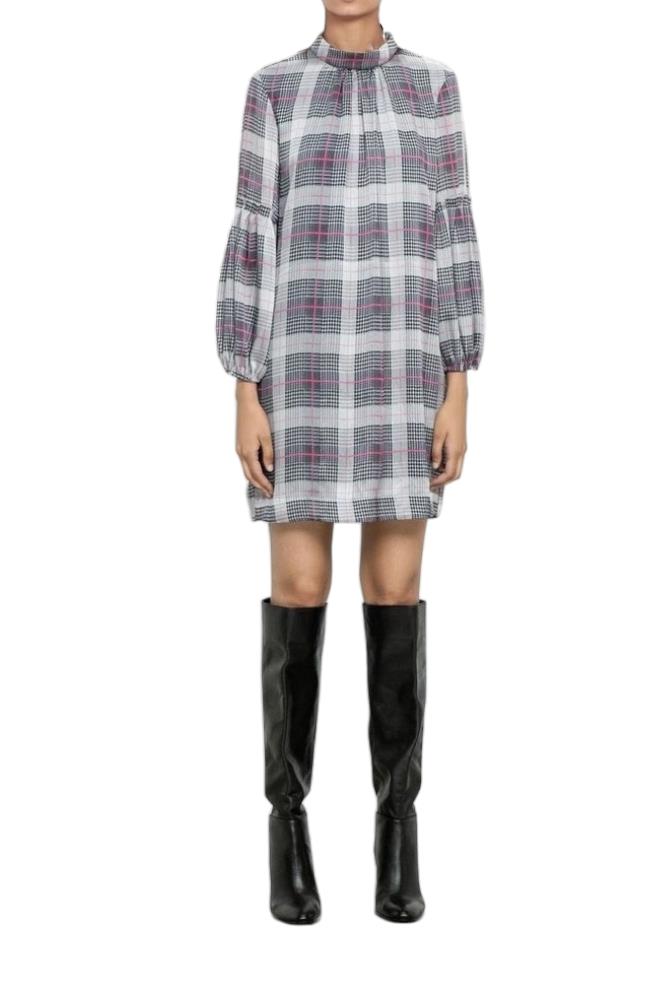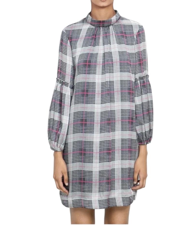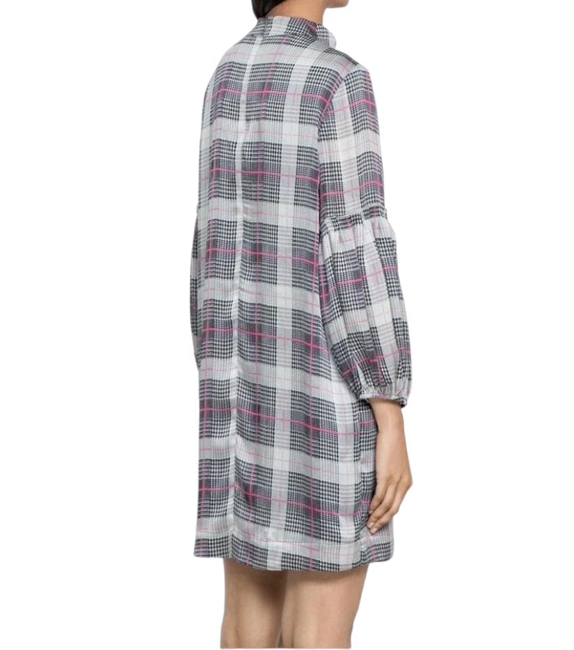 This lovely short dress with voluminous sleeves is cut from a lightweight Crinkle Check georgette fabric. The material is checkered in black, white and grey with a splash of pink, making it a playful fun dress. It has been designed in a minimal shift silhouette with a pleated blouson sleeve. , you will reach for this dress year-round for an effortless throw-on-and-go look. This dress will look great with knee-high boots, ankle boots or even trainers.