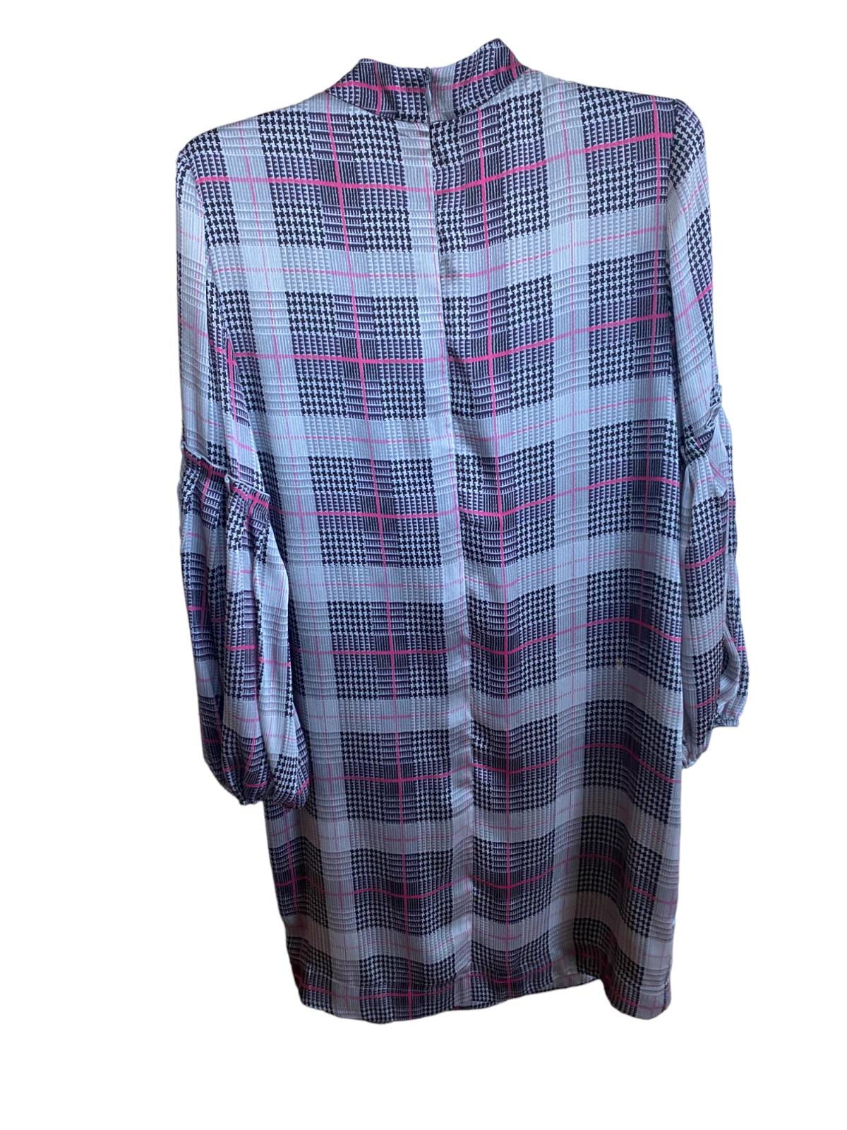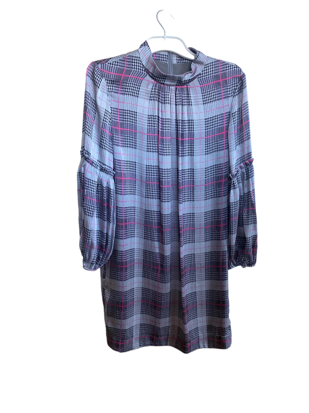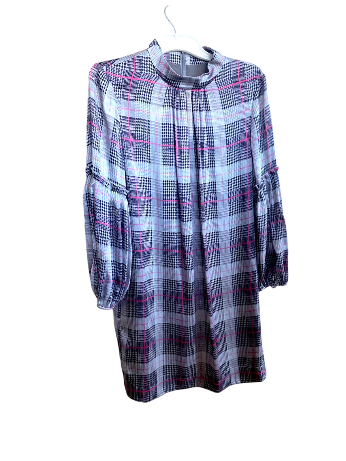 Veronika Maine Crinkle Short Dress | Grey/Pink Checkered, Blouson Sleeve, Shift